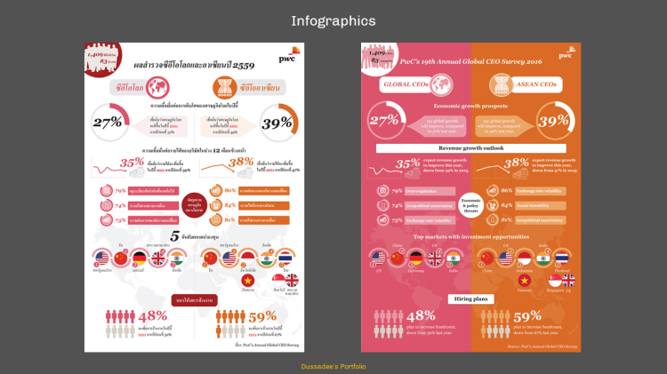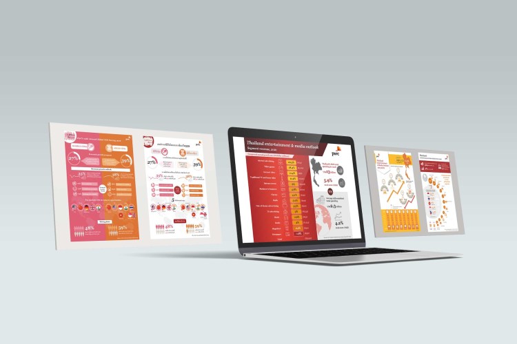 I created infographics for the annual CEO survey project, Entertainment & Media Outlook, and other reposts for our PR team that were provided to the media for presentation purposes to the public during the press briefing day. These infographics were made available to the public on Thai social media and TV channels.
